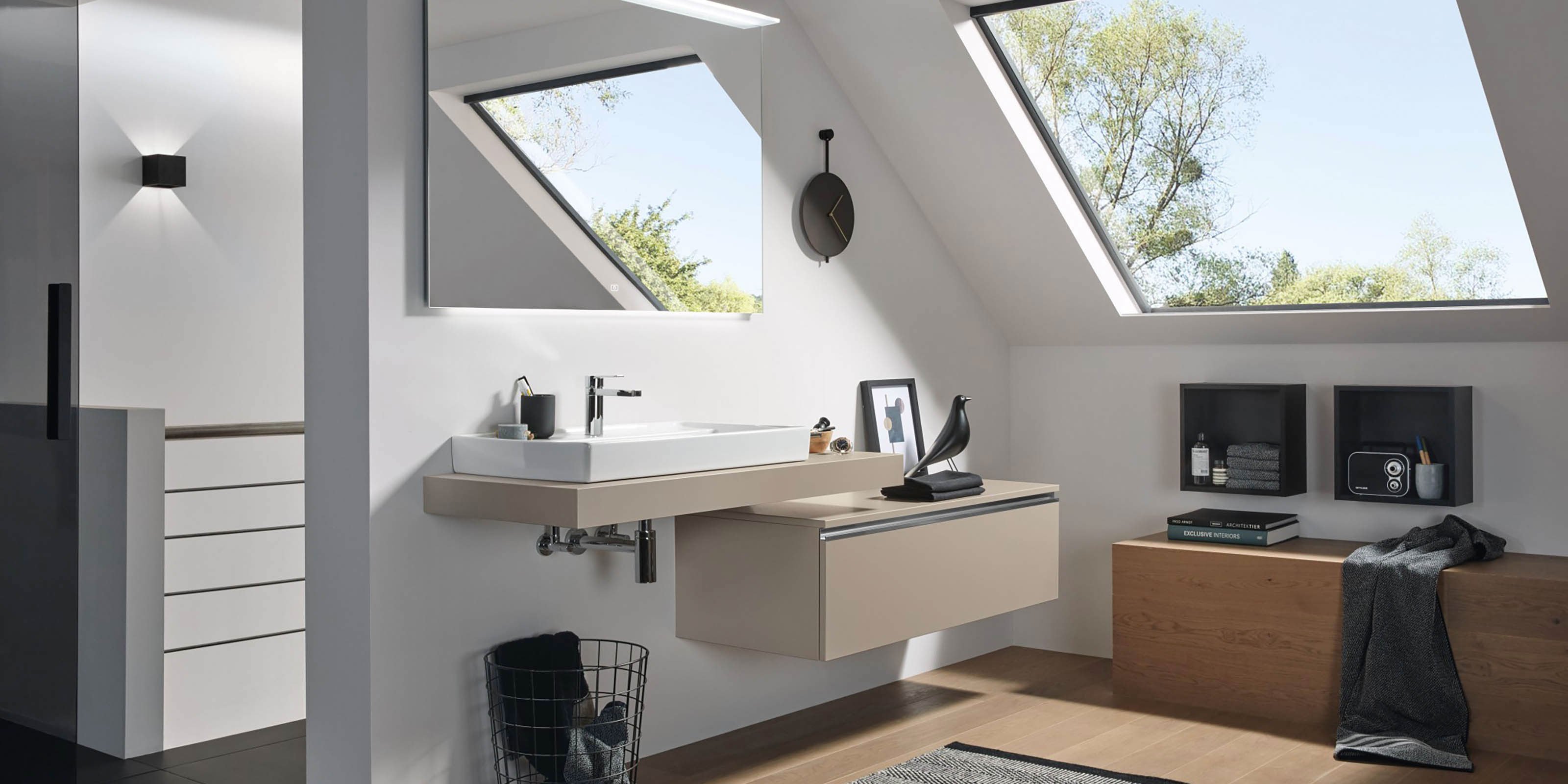 Der symmetrische Doppelwaschplatz mit vier Auszügen und offenem, breitenvariablen Regal bietet spielend Platz für zwei. Seine pflegeleichte, schwarz matte Oberfläche mit Anti-Fingerprint-Effekt steht in gekonntem Kontrast zum hellen Holzton der 2morrow Platte Slim. Einen edlen Touch verleihen die Griffe in Gold Matt mit dazu passenden Wandarmaturen. Die beiden auffälligen, runden Reflection Lichtspiegel LOLA sorgen für stimmungsvolles Licht, das per Raumschaltung bedient wird.